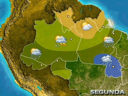 Ocorrem pancadas de chuva a qualquer momento do dia em RO, no AC, no TO, no sul do AM e do PA e leste do PA. Em RR, no norte do AM,no noroeste do PA e AP o sol predomina e não chove. Sol com pancadas de chuva à tarde nas demais áreas.