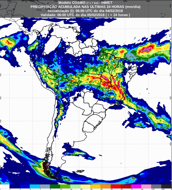 Veja o mapa com a previsão de precipitação acumulada para até 72 horas (05/02 a 07/02) para todo o Brasil: