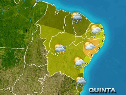 Áreas de instabilidade associadas ao tempo quente e úmido provocam chuva a qualquer hora no MA, no PI, no centro-sul do CE e no norte e sul da BA. Há risco de chuva forte. Nas demais áreas da região o sol brilha forte e chove rápido.