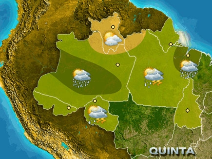 Quinta-feira de sol forte, calor e tempo firme em RR e norte do AM. No norte do TO e no sul e leste do PA o sol aparece entre muitas nuvens e ocorrem pancadas de chuva a qualquer hora. Sol, calor e pancadas rápidas de chuva à tarde nas demais áreas.