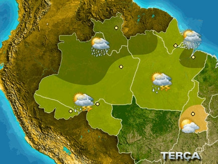 Muitas nuvens com períodos de nublado e chuva a qualquer hora do dia no centro-norte e leste do AM, no sul RR, no oeste do PA e no litoral do PA e do AP. Sol o dia todo no centro-sul do TO. Pancadas de chuva principalmente à tarde nas demais áreas.