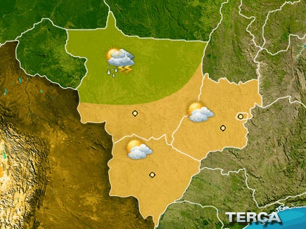 Sol forte no Centro-Oeste do Brasil. A maior umidade do ar favorece as pancadas de chuva a partir da tarde no centro-norte de MT. Nas horas mais quentes do dia a umidade do ar diminui bastante nas áreas sem chuva.