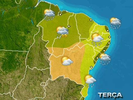 Nublado com um pouco de sol e chuva no leste da BA, SE e AL e norte do CE, PI e MA. Tempo seco no centro-oeste da BA e sul do PI. Sol e chuva com raios à tarde nas demais áreas do PI e do MA e CE. Sol e chuva passageira nas outras áreas do Nordeste.