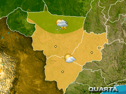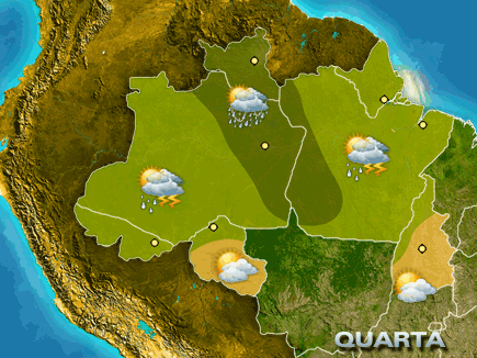 Períodos de céu nublado com um pouco de sol e chuva a qualquer hora em RR e no noroeste do PR. Sol o dia todo no centro-sul de RO e no centro-sul e leste do TO. Demais áreas têm pancadas de chuva com raios principalmente a partir da tarde.