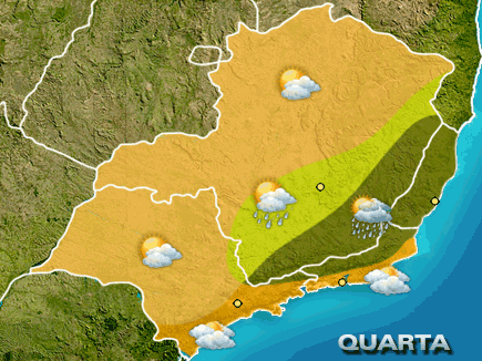Sol entre muitas nuvens, com períodos de nublado e chuva no sul e leste de MG, no ES e no interior do RJ. Demais áreas do RJ, o leste de SP e o centro de MG, também têm sol entre muitas nuvens, mas sem chuva. Sol forte nas demais áreas