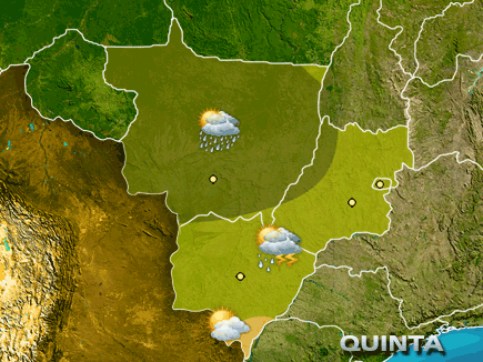 Clima: Chuvas também são previstas no Norte do país nesta quinta-feira. Na região Sul e no sul de MS, massa de ar seco mantém o tempo firme. Nos próximos dias, precipitações seguem na faixa central e volume acumulado pode chegar a 150 mm em MG e GO. Poucas chuvas são previstas no Sul do Brasil.