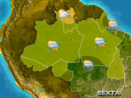 Ainda não chove em RR nesta sexta-feira. Nas demais áreas o sol aparece e chove em vários momentos. No TO, oeste do AC e leste do PA, o céu fica com mais nebulosidade e chove a qualquer hora.