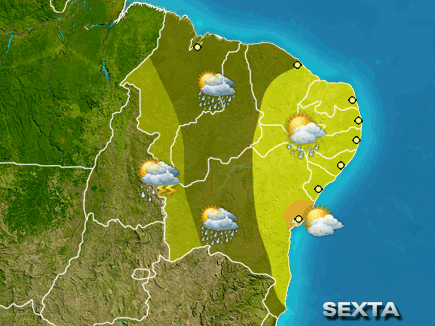 Sexta-feira com tempo instável do MA ao norte do CE e chove a qualquer hora. As demais áreas no leste da região Nordeste pode ter chuva passageira, mas pelo interior da Região pancadas de chuva à tarde. Não chove no litoral norte da BA.