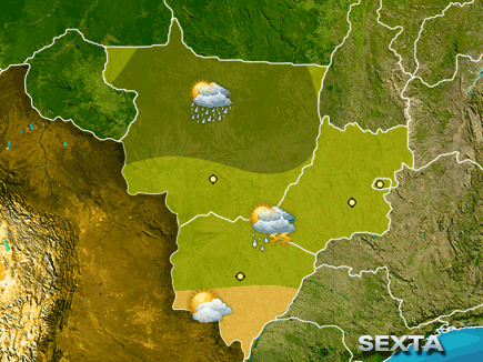 O tempo segue instável e chove a qualquer hora no leste do MT, GO e DF. O sol brilha forte em toda a Região, por causa do calor e da alta umidade há previsão de pancadas de chuva principalmente entre a tarde e a noite. Não chove no sul do MS.