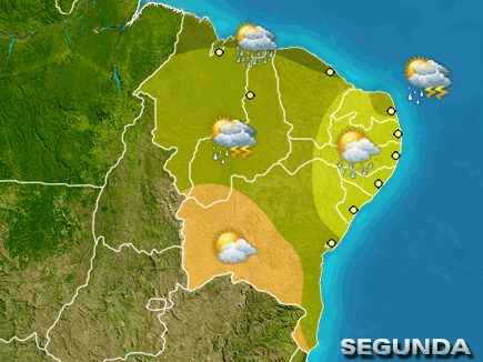 O ar fica mais seco no centro-oeste da Bahia. Chove rápido entre o RN, a PB, PE, AL e SE. Nas demais áreas da Região, faz sol, calor e ocorrem pancadas de chuva isoladas a partir da tarde. Apenas o litoral do MA tem chuva a qualquer hora.