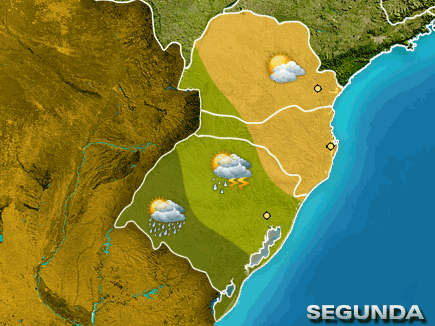Segunda-feira não deve ter chuvas no Paraná, Sudeste, Centro-oeste e Matopiba. Áreas com chuva ficará restrita à partes do Rio Grande do Sul, Roraima e Pará.