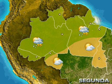 Nesta segunda-feira, áreas de instabilidade causam chuva frequente no norte da Região. A partir da tarde, pancadas de chuva devem ocorrer nas demais áreas, exceto entre RO, o sul do estado do PA e no TO, onde o tempo segue firme.