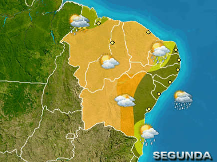 Os ventos marítimos causam chuva intermitente no litoral norte da BA, SE e PE. Demais áreas costeiras, com chuva passageira no final do dia. Entre o litoral do PI, CE e no interior dos estados, o tempo fica firme e o céu tem predomínio de sol.