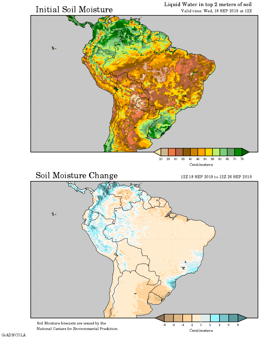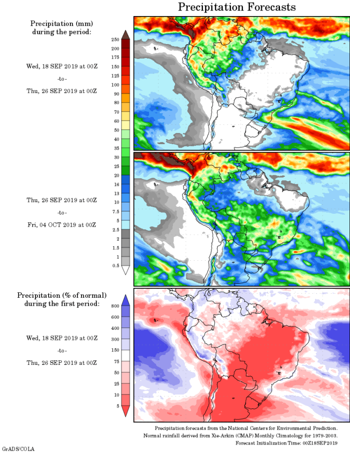Outra frente fria está prevista para chegar no final de setembro, a partir do dia 26. Esta sim começa a trazer melhores condições hídricas para o plantio. Além disso, o bloqueio na região central começa a diminuir, o que trará condições de maior umidade. Ele indica que a primeira quinzena de outubro deverá apresentar chuvas com maior frequência, melhorando as condições de plantio.