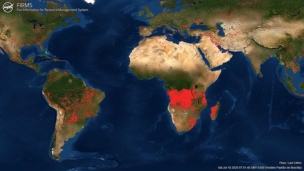 Vendo este mapa de focos de fogo no mundo, publicado hoje (18/7/2020) pela NASA, você diria que a preocupação internacional é só com a preservação das florestas, sem intenção de criar barreiras à agropecuária brasileira?"