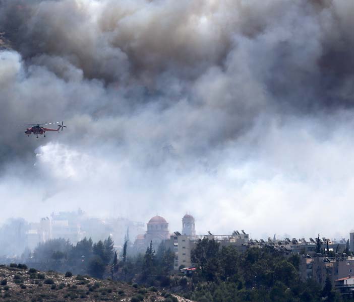 A fumaça de incêndios florestais pairava sobre Atenas nesta sexta-feira enquanto o fogo atiçado por fortes ventos e altas temperaturas se alastrava pela floresta ao redor da capital grega, forçando moradores a fugir de suas casas.