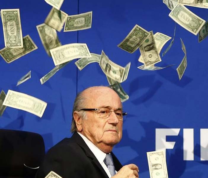 O presidente da Fifa, Joseph Blatter, foi alvo de uma chuva de notas de dinheiro falso jogadas por um manifestante britânico antes do início de uma entrevista coletiva nesta segunda-feira na sede da entidade e, visivelmente abalado, saiu do auditório.
