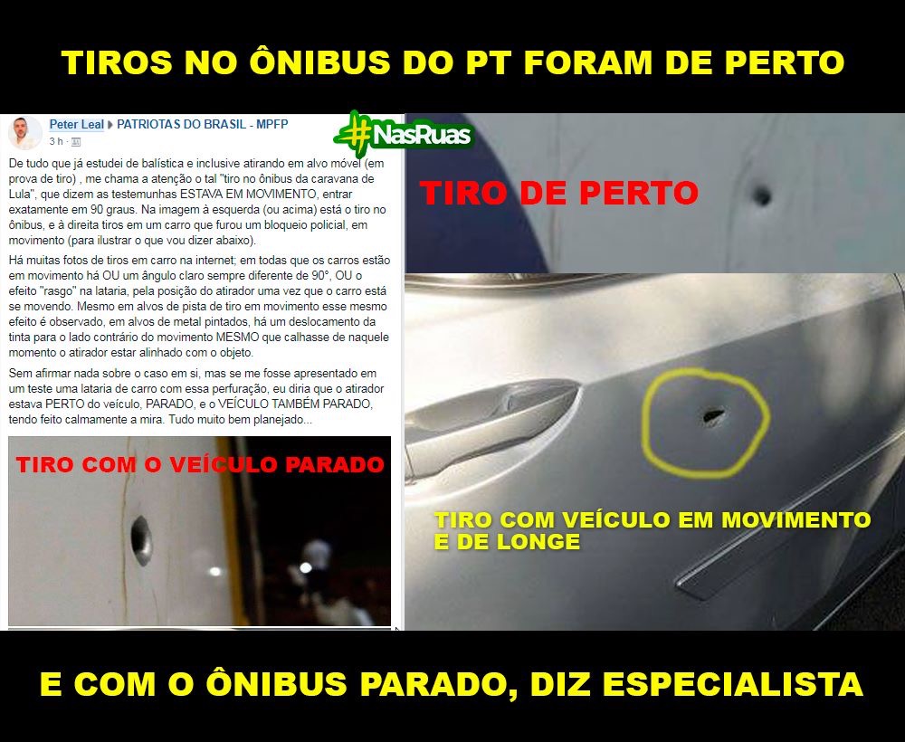 O "velho golpe dos tiros em veiculo de politico que não acerta ninguém", isso já é uma velha tática de políticos decadentes, mesmo porque não precisa ser perito criminal para constatar que o orifício dos tiros no ônibus foi com o veículo parado, e outra situação que deve ser observada que o ocorrido foi dentro do reduto que a caravana foi bem recebida..., um tanto quanto suspeito tal atentado.