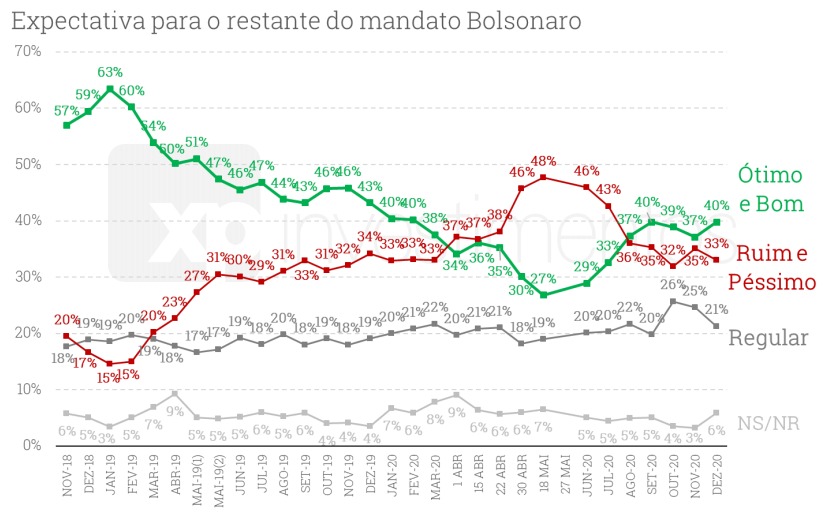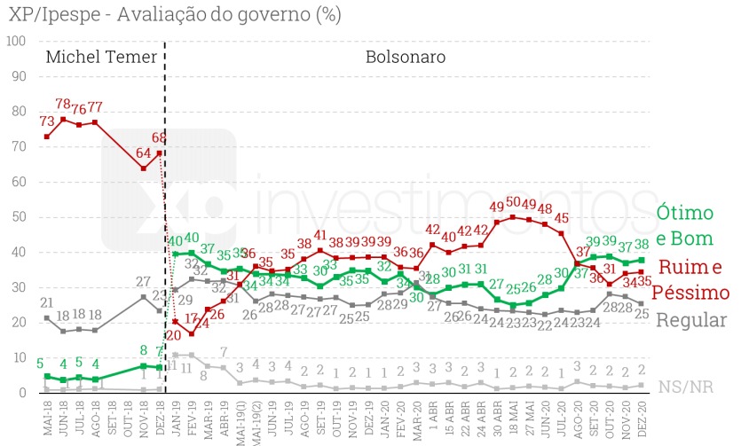 A rodada de dezembro da pesquisa XP/Ipespe mostra que o presidente Jair Bolsonaro manteve o patamar de aprovação do mês anterior, a despeito do agravamento da pandemia de coronavírus e da redução do valor do auxílio emergencial, em curso desde outubro.