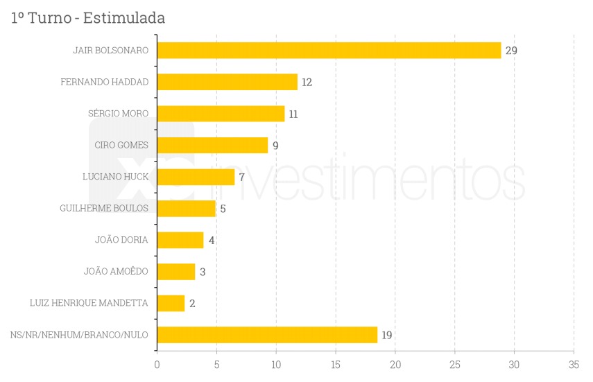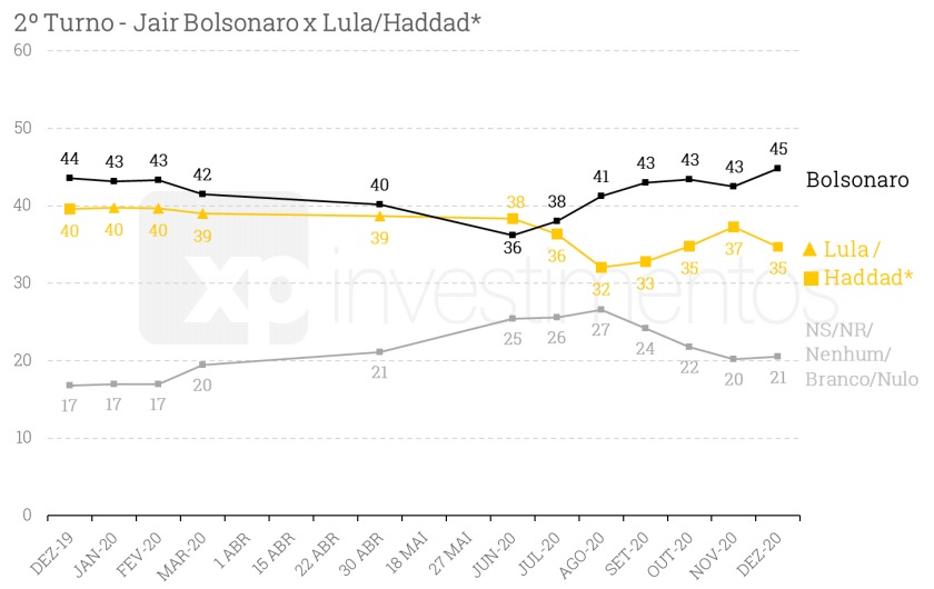 A rodada de dezembro da pesquisa XP/Ipespe mostra também que, se a eleição fosse hoje, o presidente Jair Bolsonaro lideraria com 29% das intenções de voto. Ele aparece à frente de Fernando Haddad (PT), com 12%, Sérgio Moro, com 11%, Ciro Gomes (PDT), com 9%, e Luciano Juck, com 7%. Guilherme Boulos (PSOL) aparece com 5% -- é o primeiro resultado divulgado com o candidato, depois de sua ida ao segundo turno na disputa pela capital de São Paulo.