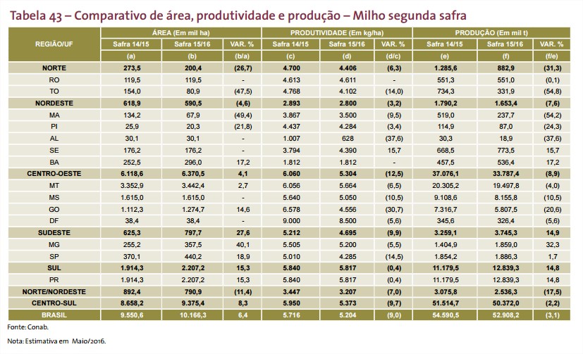 Do mesmo modo, os números referentes à safrinha de milho também foram divulgados erroneamente. Assim como aconteceu com a soja, a entidade manteve as projeções anunciadas em abril, com uma produção ao redor de 87 mil toneladas. Entretanto, de acordo com a tabela atualizada, a perspectiva é que os agricultores colham 76,7 mil toneladas do cereal. Na safrinha do ano passado foram colhidas 114,9 mil toneladas do grão.