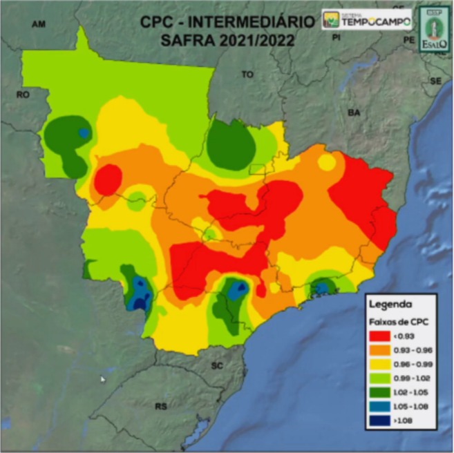 Em um cenário intermediário, conforme o Coeficiente de Produtividade Climática (CPC) do TempoCampo, que engloba previsões de chuva, temperatura, radiação e aspectos climáticos da cana, a safra 2021/22 tem condição bastante irregular no Brasil em termos de produtividade, mas aponta uma safra predominantemente pior do que a última.